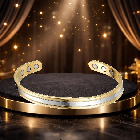 Neodymium magnets, (6 x 3000 Gauss) are considered the most effective in increasing blood flow to area’s need This Crafted copper bracelet features a sleek silver-tone band bordered by elegant gold edges. Designed with six powerful therapeutic magnets, it's both a stylish accessory and a wellness aid. The adjustable open cuff design ensures a comfortable fit for most wrist sizes.