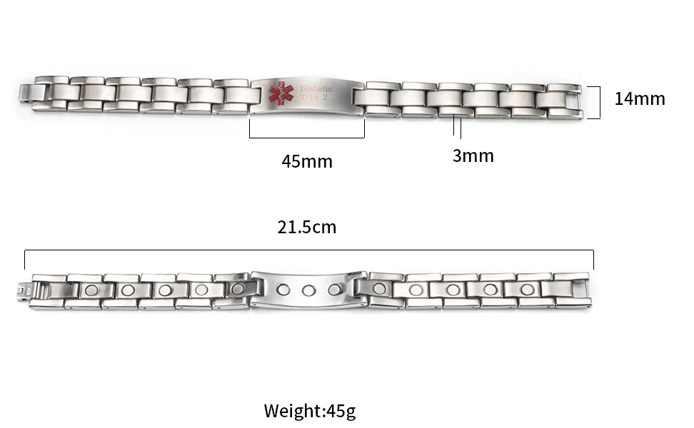 Play safe and stylish with our unisex Titanium Medical Alert Magnetic Bracelet, perfect for men and women to Communicate your Medical Priorities to carers - Paramedics in an Emergency. Our Pure Titanium Bracelet has 12 x 3000 gauss magnets comfortable fitted underneath to Assist also with pain and circulation issues. Features bold red-plated Medical symbol to make others aware of your medical requirements.