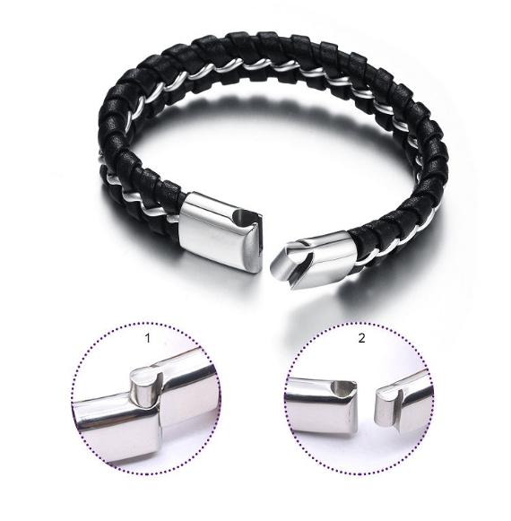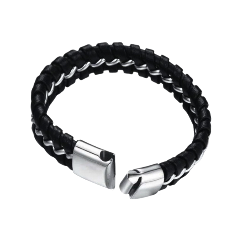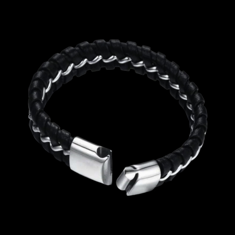 This stylish bracelet combines the durability of black braided leather with the sleekness of stainless steel. Perfect for both men and boys, it features tightly woven leather and a stainless steel magnetic clasp for easy wear.