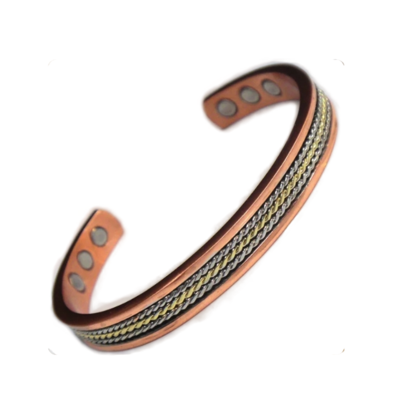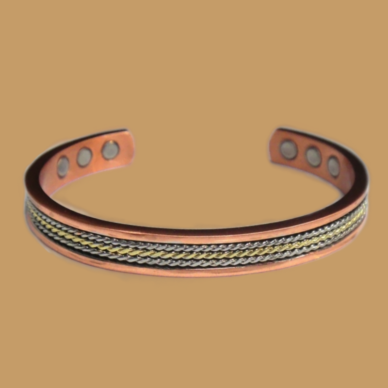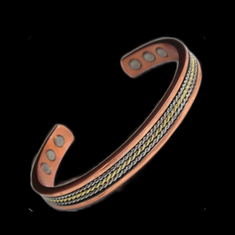 Crafted from solid copper with a gold and silver twist inlay, this stylish cuff combines classic elegance with the wellness benefits of magnetic therapy.
